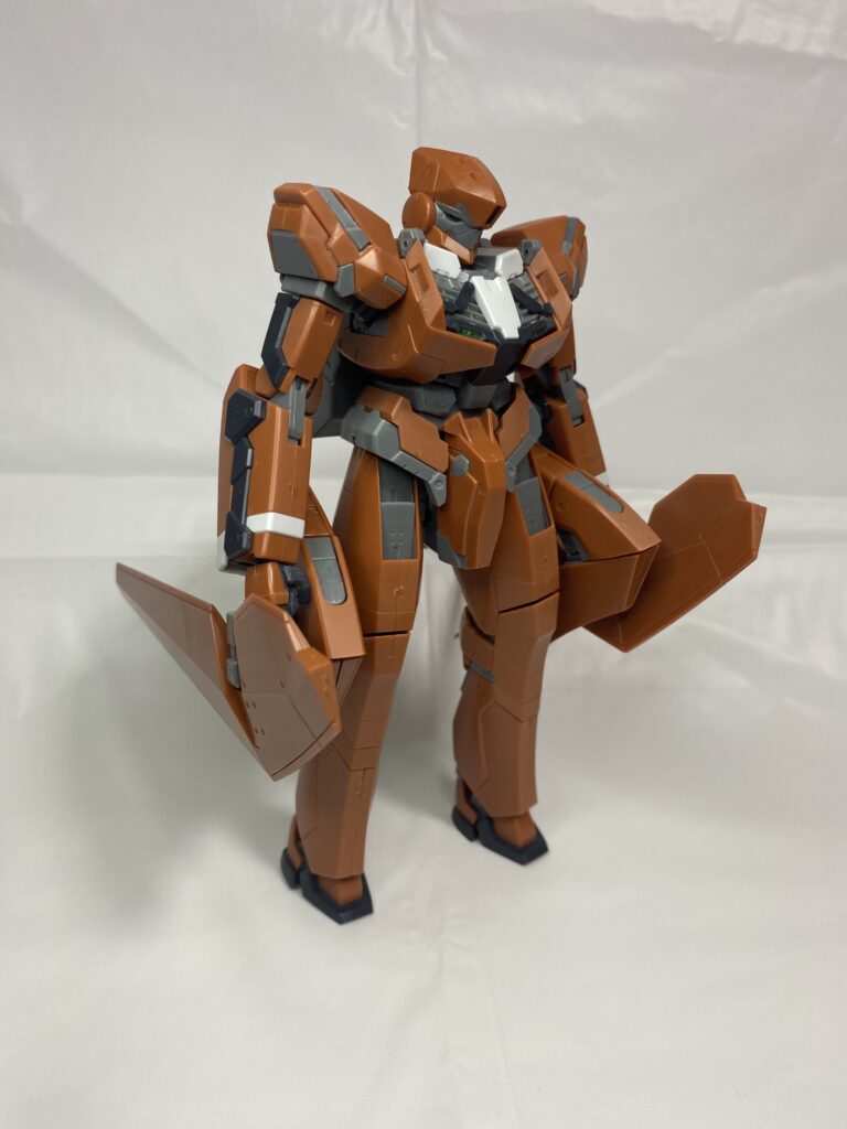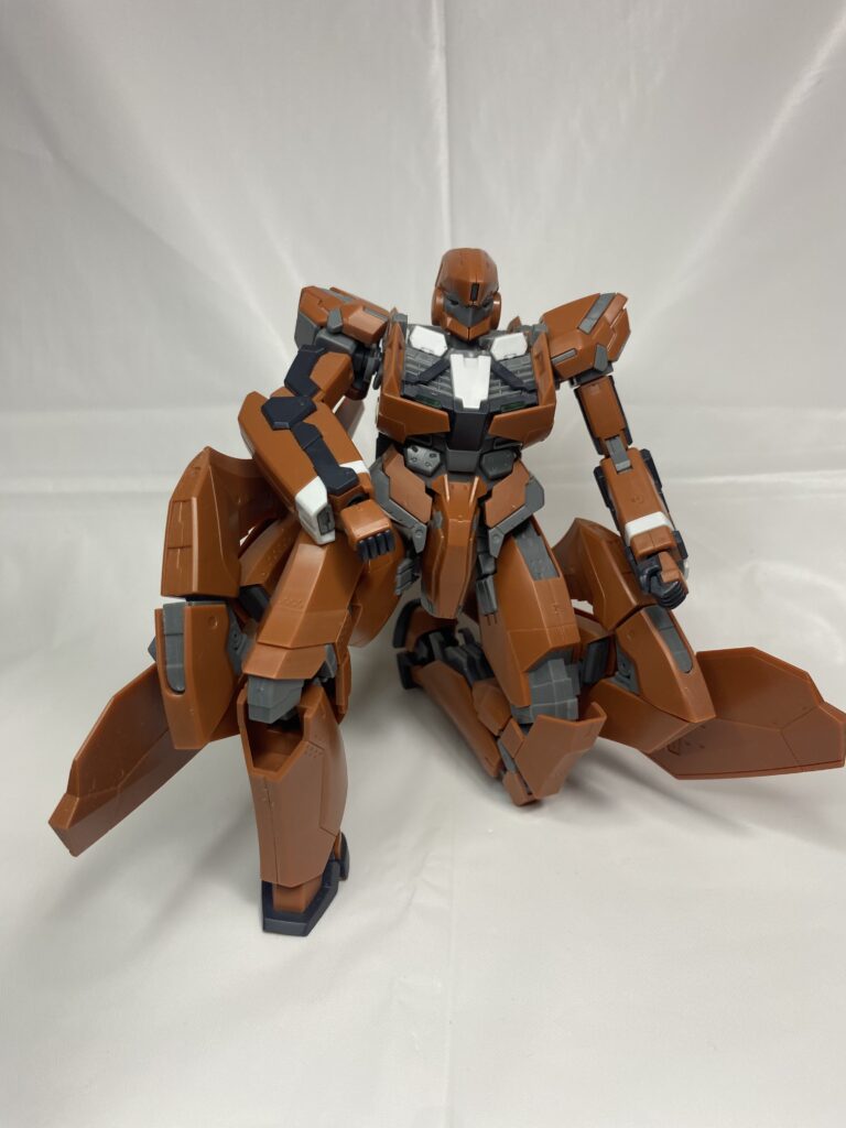 すべてを組み立てると足長な感じですね、アニメだとそんなに感じなかったですが、バックパックと飛行ユニットを取り付けると全体的にバランスが出ます。膝立ちがかっこいいですね。アニメだと主人公に乗り捨てられるたり、敵によく破壊され散々な機体ですが、ボトムズみたいな渋さがあり印象的な機体です。
